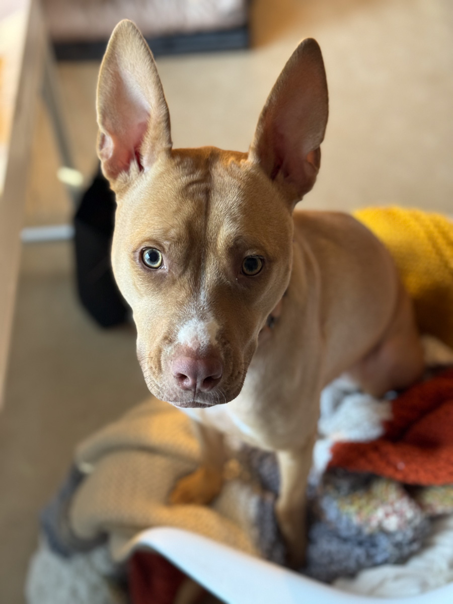 2.5yr old pitbull/kangaroo mix (I kid, it’s the ears). According to her sister’s DNA results, she might be 51% American Pit Bull, 14% German Shepherd, 14% Siberian Husky, 11% Australian Cattle Dog, and 10% Supermutt. Not sure how accurate those results are, though.